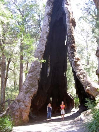 De tocht is inderdaad mooi. Af en toe bekruipt ons weer een beetje het ‘Wat is het toch gemeen, wat hebben sommige landen toch veel moois’ gevoel. Dat is natuurlijk niet helemaal eerlijk, want Nederland heeft ook genoeg mooie plekjes, en op de Friese wateren zijn wij nog lang niet uitgekeken, maar toch ….. Een heerlijk heuvellandschap met idyllische meertjes tussen de wijnranken. En dat allemaal op een steenworp afstand van prachtige baaien en stranden. Die op hun beurt weer worden bevolkt door dolfijnen en walvissen. Zucht. Het plaatsje Margaret River valt ons wat tegen. Het is een echt toeristendorpje. Veel winkels en daarnaast nog wat winkels. Wel komen we hier dus ook een internet café tegen, waar René voor een paar dollar de website weer van foto’s voorziet. Dat is dan maar weer mooi meegenomen. Net buiten het dorpje, midden in de bossen, hebben een aantal mensen een paar oude gebouwen hersteld. Een woning, een schooltje, een schuur voor werktuigen die in de bossen werden gebruikt, en wat kangoeroes en emoes. Het ligt er weer prachtig, een watertje er omheen, en de bomen beginnen hier al aardig hoog te worden. Als afsluiting van onze rondrit door de omgeving bezoeken we nog een snoepfabriek en een chocoladefabriek. Althans, dat zeggen de folders. Het valt ons een beetje tegen, de honeycrunch smaakt heerlijk. Maar van een echte fabriek is geen sprake. In beide gevallen is in de winkel een raam aanwezig, waardoor je kunt zien hoe ze de chocolade en eventueel andere zoetigheden smelten en in vormpjes scheppen. Bij Borrel in Zwolle zie je meer, en is de chocolade ook nog lekkerder. Maar goed dat ze dat hier in Australië niet weten. De meeste mensen hier zijn breed genoeg 😉 De rest van de dag heerlijk lummelen, het is redelijk weer. Onze beslissing om zondag tot stranddag uit te roepen heeft erg goed uitgepakt. Vandaag is het weer een graadje of 19. Wel weer leuk om nog even vanaf het campingterras naar de surfers te kijken. ’s Avonds even lekker Acda en de Munnik op de CD walkman gezet, en een concert voor de zee gegeven. Die klaagt in ieder geval niet, en roept niet: ‘Mama, niet zo há-hard’. Heerlijk gevoel, ik ga me vast voorbereiden op een volgend concert. Eens even kijken of het U2 wordt of Anastacia 🙂 Dinsdagochtend door naar Pemberton. Voor het eerst deze reis verdwalen we. Nou ja, verdwalen. We rijden een dikke 20 kilometer om. Geen van ons tweeën heeft de bordjes gezien die ons via een klein tussendoor weggetje precies op de weg naar Pemberton zouden brengen. Geen nood overigens, de omgeving is hier ook prachtig. We rijden namelijk weer door een National Park. Leeuwin geheten, u mag raden waarom. Juist, ook hier was het een Nederlands schip dat voor het eerst langs deze kust voer. De bomen worden hoger en hoger. Mooi gezicht. Begin van de middag komen we aan in Pemberton. De camping wordt door de Lonely Planet als ‘charming’ aangegeven, en is dat ook. We betalen voor 2 nachten slechts $ 28. Dat is wel heul erg weinig. We moeten hard nadenken, en constateren dat we alleen bij een roadhouse in de Nullabor ooit minder hebben betaald. Namelijk $ 11 per nacht. Het is een echte boscamping. We vinden een geweldig plekje, met helemaal groen uitzicht, en een ‘stookpot’ voor de deur. De Australiërs vinden BBQ-en erg belangrijk, en elke camping heeft wel een aantal publieke BBQ’s. Deze camping maakt het wel erg bont, bij meer dan de helft van de plaatsen staat een gietijzeren stookpot. Aan hout geen gebrek hier, er ligt een giga berg brandhout die door de camping wordt aangevuld. We besluiten dan ook een heerlijk kampvuurtje te maken ’s avonds. Maar eerst nog even naar het toeristenbureau, en de hoge branduitkijk opzoeken. Ze hebben hier in Zuidwest Australië een aantal uitkijken in bomen gebouwd. Van hieruit werd en wordt tot op de dag van vandaag, gespeurd naar beginnende branden. Een van deze uitkijken is de Gloucester Lookout net buiten Pemberton, deze is bijna 60 meter hoog. Er aangekomen moeten we toch even wat slikken. Oei, het is wel erg hoog, en om nou te zeggen dat ze er alles aan hebben gedaan om de boom klimveilig te maken, nou nee. Het komt erop neer dat ze een stevige boom hebben uitgezocht, en rondom de boom stalen pinnen hebben geslagen, op een afstand van ongeveer 35-40 centimeter van elkaar. Daarlangs aan de buitenkant loopt een dun draadje. En voilá, klaar om te klimmen. Slik. René merkt op dat in Nederland zoiets niet mogelijk zou zijn, dit werd door welke keuringsdienst dan ook afgekeurd. Aan de andere kant, de toeristen zullen er wel niet bij bosjes uitvallen, anders was hij vast wel gesloten. Ik klim er een meter of 10 in, en besluit er nog even een nachtje over te slapen. Bij terugkomst op aarde komt er een man op Mirthe af, Mirthe heeft namelijk even bij wat vogels staan te kijken. Het zijn wat groot uitgevallen kanariepieten, mooie felle kleuren, en door de aanwezigheid van al die toeristen natuurlijk redelijk tam. De man heeft wat vogelzaad en wil dat aan Mirthe en Lisa geven. Van Lisa hoeft het niet. Mirthe en ik nemen het voer dan maar in ontvangst. En binnen een paar seconden komen de vogels op ons af. Ze zitten op ons hoofd, schouders, armen en handen. Een grappig gevoel. Zeker als ze ook af en toe nog een beetje gaan zitten kissebissen om het voer. Het levert een paar leuke plaatjes op. Ook op de camping zijn gekleurde papagaai-achtigen te bewonderen. Deze zijn nog weer een slag groter dan de vogels bij de Gloucester tree. Eind van de middag even mijn zus(je) gebeld. Over een week of twee bevalt zij van haar, sorry Jeroen, hun eerste kind. We hebben gisteren een prachtige dikke buik foto van haar gekregen. Heel raar gezicht, mijn zus met zo’n buik, het lijkt een beetje een trucagefoto, want ik ken haar zo niet. Maar het schijnt toch echt waar te zijn, dat vertellen de andere familieleden mij in ieder geval ook. Het is overigens fijn te horen dat het zo goed met haar gaat. Ze moeten maar gauw aan een tweede beginnen 