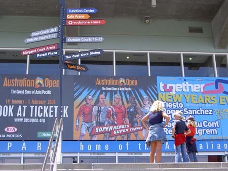 Nadat we onze dorst hebben gelest, de magen hebben gevuld en de benen de nodige rust hebben gegeven wandelen we naar rivier de Yarra. Dwars door Melbourne slingert deze rivier die uiteindelijk uitmondt in de gigantische baai waar Melbourne aan ligt. Via een antieke, Victorian style, brug lopen we naar de overkant van de Yarra. Daar ligt het grote Rod Laver tenniscentrum en de Melbourne Cricket Grounds. Met daarnaast nog weer een aantal gigantische evenementhallen. Volgende week begint hier in Melbourne de Australian Open tenniskampioenschappen. Er wordt druk gewerkt aan het opbouwen van de nodige extra tribunes en allerlei partytenten. Het hele complex is behoorlijk toegankelijk en we kunnen zomaar de grootste tennisarena binnenwandelen. Zonder het echt in de gaten te hebben staan we plotseling aan de rand van het Centre Court van de Australian Open. De baan waar de belangrijkste partijen worden afgewerkt. We worden aangesproken door een Nederlandse jongen die voor de eerste week een aantal dagkaarten had weten te bemachtigen. Hij is een echte tennisfan en geeft ons de nodige inside-information over het komende toernooi. We maken natuurlijk wat foto’s en zijn behoorlijk onder de indruk. Het is een gigantisch stadion met schuifdak. Mirthe beslist ter plekke dat ze in plaats van televisiester toch maar tennisster gaat worden.