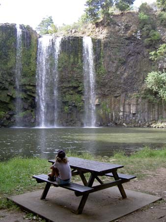 Zaterdag 10 januari. We vertrekken ’s ochtends tegen half elf van de camping in Auckland richting het Noorden. We weten nog niet waar we precies heen rijden, dat bekijken we onderweg wel. Het kost behoorlijk wat tijd om Auckland en buitenwijken uit te komen, het is behoorlijk druk en zo hier en daar een ongelukje. Wat ons direct opvalt is de nogal agressieve rijstijl van de gemiddelde Nieuw Zeelander. Ze voegen in op het laatste moment en houden geen rekening met onervaren camperbestuurders. Nieuw Zeeland ziet er heel anders uit dan Australië, veel groener en bergachtiger. Gelukkig heeft de camper behoorlijk veel vermogen (4,7 liter turbodieselinjectie!!!) en we hobbelen behoorlijk makkelijk de hellingkjes op en af. We merken wel dat het afleggen van veel kilometers hier ook veel meer tijd kost dan in Australië. De dieselprijzen zijn wel erg gunstig, een litertje kost 0,60 NZD, ongeveer 30 eurocent. Halverwege de middag komen we aan in Whangarei, een behoorlijke plaats aan een baai. We zoeken een camping iets ten noorden van Whangarei, met direct ernaast een prachtige waterval. De kinderen springen eerst in het zwembad en testen de grote trampoline. Daarna wandelen we naar de waterval met z’n viertjes. Er is een prachtige wandelroute aangelegd rond de waterval, erg mooi om te zien. Veel groen, hoge bomen en indrukwekkende rotspartijen.