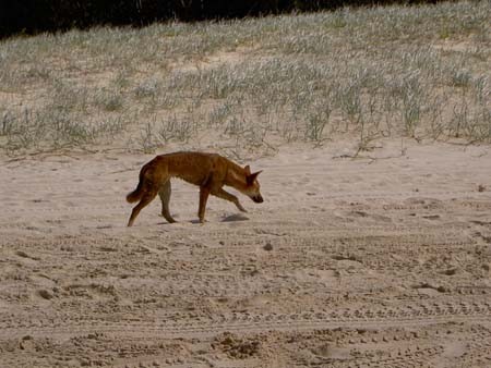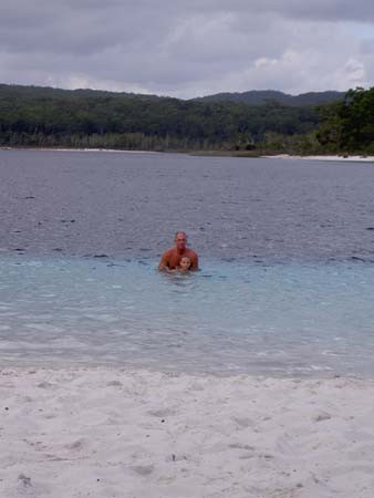 Wij blijven twee dagen, dus ook een nachtje slapen, op Fraser Island. We doen dat met onze eigen Landrover. Want de enige manier om er rond te rijden is met een Four Wheel Drive. De routes die er zijn bestaan uit mulle zandpaden en de hoofdroute is het strand langs de Oostkust. Omdat niet iedereen een 4WD heeft barst het in Hervey Bay van de 4WD-verhuurbedrijven. Maar ook mensen die wel een eigen 4WD bezitten kiezen er vaak voor om toch maar met een gehuurde 4WD het eiland op te gaan. Dit natuurlijk in verband met de redelijk ruige omstandigheden waar je mee te maken gaat krijgen. We hebben er zelf ook wel over gedacht om te huren, of eventueel een georganiseerde tour te kiezen, maar uiteindelijk hebben we toch maar besloten dat we juist voor dit soort gelegenheden een 4WD gekocht hebben. Bovendien is ie goed verzekerd en we gaan er gewoon voor. Dus maandagochtend de tentjes en de andere kampeerspullen maar weer ingepakt en met een volgeladen auto rijden we richting de ferry. De ferryovertocht hadden we al besproken en we gaan om 11:00 uur naar de overkant. Behalve de ferrykosten moet je ook een vergunning kopen om op Fraser Island rond te mogen rijden en natuurlijk nog de “permits” voor de campingovernachting. Alles bij elkaar kost het avontuurtje “Fraser Island” zo’n 160 dollar. Voordat we de ferry oprijden laten we onze banden een beetje leeglopen. Op zand heb je meer grip als de banden zacht zijn. Iedereen doet dat trouwens, het is dus niet zo dat wij slimmer zijn dan de rest. Veel backpackers huren met een groep een auto met kampeeruitrusting. Ze zitten dan ongeveer met z’n tienen in een verlengde Toyota Landcruiser. Niet echt comfortabel maar wel gezellig, en met z’n tienen ook betaalbaar. Iets voor het middaguur rijden we de ferry af, ofwel we zijn op Fraser Island. De eerste paar honderd meter ligt er nog asfalt maar al snel wordt het een zandpad. We vinden het wel een beetje spannend, echt veel ervaring met het rijden op zand hebben we nou ook weer niet. Onze eerste bestemming is het Lake McKenzie, een prachtig zoetwater meer, midden op Fraser Island. De eerste 15 kilometer over het mulle karrenspoor verloopt redelijk soepel. Alhoewel het pad in beide richtingen gebruikt wordt is het niet breder dan één auto. Dus zodra er een tegenligger verschijnt moet één van de twee een “passingbay” in. Dat is een stuk extra ruimte aangelegd op bepaalde plekken langs de weg. Het nadeel van die uitwijkplekken is dat ze meestal nog muller zijn dan het hoofdspoor. We hopen maar dat we niet teveel tegenliggers gaan krijgen. Gelukkig valt dat ook wel mee, en na een klein uurtje zijn we 15 kilometer verder, bij Lake McKenzie. Daar is het behoorlijk druk, ook wel logisch want op het strand kan je nu nog niet zijn. Het strand is alleen berijdbaar tot twee uur voor hoogwater en vanaf twee uur na hoogwater. Voor vandaag betekent dat dus dat we er pas om half drie terecht kunnen. Om te zwemmen moet je trouwens ook niet op het strand zijn want er zitten veel haaien en andere onvriendelijke visjes. Dit alles verklaart waarom er nu vrij veel mensen bij Lake McKenzie zijn. Niet teveel trouwens, want het is behoorlijk groot. Het water is zoet en superhelder, ik heb nog nooit zulk helder water gezien. Het zand er omheen is spierwit en om het strand ligt het regenwoud.Je kan je waarschijnlijk wel voorstellen dat dit alles er prachtig uitziet. Het is vandaag geen zonnige dag maar wel lekker warm. Omdat we morgenmiddag ook nog vrij veel tijd hebben gaan we nu nog niet uitgebreid zwemmen. We eten onze boterhammetjes en ruim een half uur later gaan we op pad richting het strand aan de Oostkant. Dat is dus weer een uurtje karrensporen. Dit tweede deel is op bepaalde plekken nog ruiger dan het eerste deel. Regelmatig diepe kuilen in het pad en we moeten zo af en toe een heuveltje over. En juist op die heuvels is het spoor erg slecht. Maar we redden het zonder kleerscheuren, de Landrover puft en hijgt maar voelt zich toch behoorlijk thuis in deze omgeving. We komen aan bij een vakantieverblijf (resort) in het midden aan het Oostelijke strand. Er zijn er een stuk of drie op het eiland, veel touroperators maken er gebruik van om hun klanten een nachtje over te laten blijven. Bij de resorts zijn geen campings maar wel wat andere voorzieningen, zoals ijsjes. Het is ook bijna half drie dus we kunnen het strand gebruiken als snelweg. Eerst kijken we nog even hoe andere auto’s zich door het eerste mulle stuk ploegen om bij de redelijk harde vloedlijn uit te komen. Het lijkt erop dat dat geen probleem gaat worden, zelfs speciale Off The Road bussen rijden hier over het strand. En het wordt gebruikt als landingsbaan voor kleine vliegtuigjes die de wat rijkere toeristen het eiland rondvliegen. Op het strand ligt het tempo een stuk hoger, op de meeste plekken kan je, en mag je, tachtig rijden. We moeten wel oppassen voor waterstroompjes die vanaf het binnenland de oceaan in stromen. Ze veroorzaken soms een geul, en daar moet je niet met tachtig doorheen. Ons doel is een camping bijna in het Noordelijke puntje van Fraser Island, al met al een kleine zestig kilometer rijden langs het strand. Onderweg komen we langs een aantal “attracties”. Markante gekleurde zandbergen, een mooie diepe geul waar je je in mee kan laten voeren richting de zee en een heus scheepswrak. Zo hier en daar stappen we uit om even te kijken en wat foto’s te maken. We hebben niet echt veel tijd want voor zessen is het al donker. En het lijkt ons wel handig om met daglicht een goede kampeerplek te vinden en onze tentjes op te bouwen. Bij Indian Head, een markante rots dicht bij onze geplande camping, aangekomen hebben we een kleine tegenvaller. Vanwege Indian Head moeten we een stukje van het strand af, maar dat pad is dusdanig mul dat we daar maar niet doorheen gaan. Er staan ook wat andere mensen met 4Wd’s te kijken hoe het pad eruit ziet maar niemand durft het aan om er in te rijden. Ook wij besluiten dat we een stukkie teru
